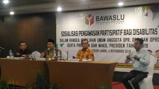 "Di Daerah lain sudah ada yang menjadi kita libatkan, seperti di Aceh salah satunya. Kalau Jambi ada yang mau, ini menjadi perhatian kita," ujarnya dalam sosialisasi pengawasan partisipatif bagi disabilitas yang digelar di Swissbell Hotel, Sabtu (4/11).