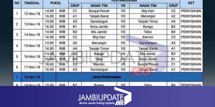 Pertandingan perdana akan tersaji antara tim Kota Sungai Penuh kontra Batanghari, sedangkan pertandingan kedua mempertemukan Tanjab Barat versus Merangin.