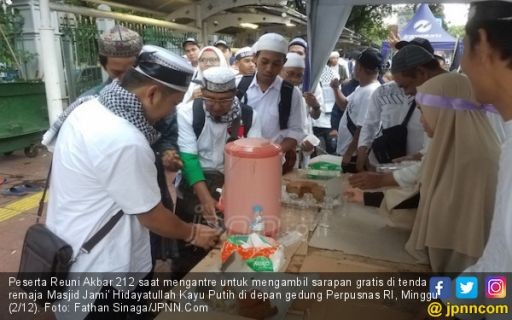Salah satu tenda didirikan oleh jemaah Masjid Jami Hidayatullah Kayu Putih, Pulogadung, Jakarta Timur. Tenda yang berada di depan gedung Perpustakaan Nasional RI itu menyediakan sarapan bagi peserta aksi Reuni 212. Andi Azhar dari remaja Masjid Jami Hidayatullah mengatakan, pihaknya membawa berbagai macam jenis makanan untuk peserta aksi.
