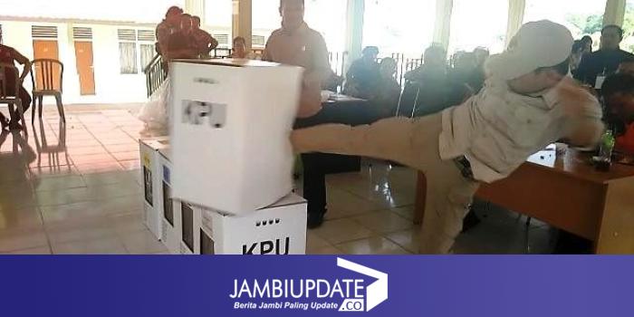 Salah seorang staf menendang kotak suara dalam simulasi yang digelar Komisi Pemlihan Umum (KPU) Provinsi Jambi dan Tanjabtim. FOTO : IST/JE