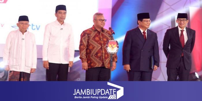 JAMBIUPDATE.CO, JAKARTA - Duet Joko Widodo - KH Maruf Amin alias Jokowi - Kiai Maruf dan Prabowo Subianto - Sandiaga Uno alias Prabowo - Sandi menaiki panggung debat kontestan Pemilihan Presiden (Pilpres) 2019 di Menara Bidakara, Jakarta Selatan, Kamis (17/1) malam sekitar pukul 20.05. Ketua Komisi Pemilihan Umum atau KPU Arief Budiman berada di tengah-tengah Jokowi - Maruf dan Prabowo - Sandi.