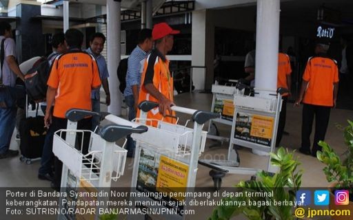 JAMBIUPDATE.CO, - Penerapan bagasi berbayar oleh sejumlah maskapai penerbangan sudah berpengaruh ke sejumlah sektor. Bukan hanya membuat usaha travel lesu, tapi juga mengakibatkan penghasilan para porter di Bandara Syamsudin Noor turun drastis.Pendapatan buruh angkut barang di bandara menurun, karena sejak bagasi gratis dihapus pada 22 Januari 201, banyak penumpang yang mengurangi barang bawaan guna menekan biaya bagasi. Mereka pun tak meminta bantuan profesi pengangkut barang di areal bandara itu.