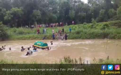 JAMBIUPDATE.CO, GRESIK - Proses pemakaman jenazah Mbah Sayu menyedot perhatian warga Gresik Selasa lalu. Para pelayat terlihat mengusung keranda jenazah nenek berusia 77 tahun itu sambil menantang derasnya arus Kali Lamong di Dusun Gorekan Lor, Desa Cermen, Kecamatan Kedamean. Saat itu sungai tengah meluap.