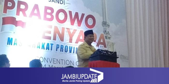 JAMBIUPDATE.CO, JAMBI- Capres Prabowo Subianto mengehentikan sementara sambutannya dalam acara menyapa masyarakat Jambi bertempat di Ratu Convention Center, Kota Jambi, Kamis (14/3).