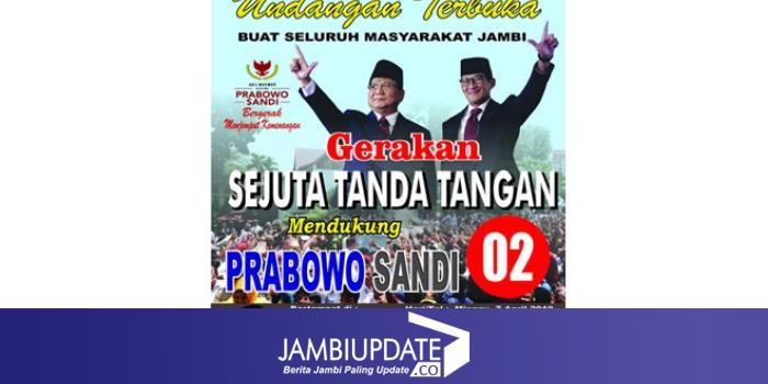 JAMBIUPDATE.CO, JAMBI - Sekretariat Bersama (Sekber) lintas relawan Prabowo-Sandi Provinsi Jambi mengagendakan gerakan sejuta tanda tangan untuk mendukung pasangan Calon Presiden dan Calon Wakil Presiden nomor urut 02 Prabowo - Sandi.