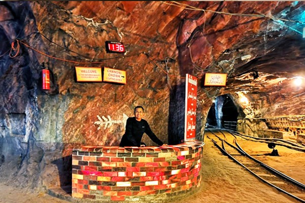 Saya pun menggunakan kereta itu. Masuk ke dalam gunung. Melalui terowongan kecil. Yang hanya cukup untuk rangkaian kereta yang mirip kereta kelinci di taman hiburan.