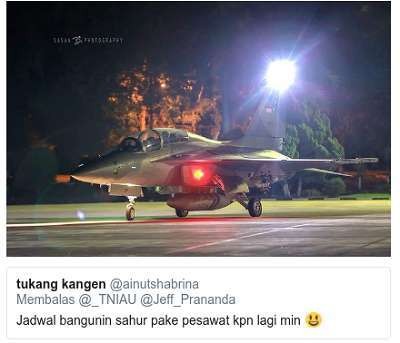 Twitter pesan oleh @_TNIAU: Jika tak ada aral melintang di runway, Insyaallah akan diadakan lagi tradisi membangunkan #sahur pakai pesawat tempur buat Airmen di Surabaya, Solo, Sragen, Klaten, Jogja, Papringan, Wirobrajan, Gejayan, Tukangan, Maguwo, Kotagede, dsk. i¿¼ #Ramadan #jauhdilangitdekatdihati Hak cipta gambar @_TNIAU@_TNIAU