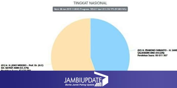 Sementara, pasangan calon nomor urut 02 atau penantang petahana, Prabowo-Sandiaga Uno, dalam perhitungan KPU harus puas di posisi kedua dengan persentase perolehan suara yaitu 44,50 persen.