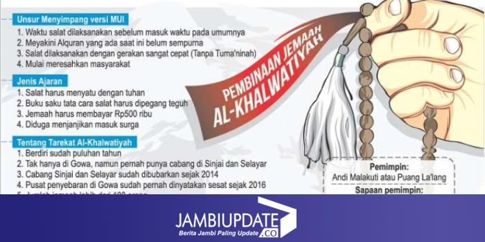 JAMBIUPDATE.CO , MAKASSAR  Sebelum keluarnya fatwa MUI terkait kesesatan Tajul Khalwatiyah pimpinan Puang La lang, tiga Tarekat Khalwatiyah lainnya lebih dahulu dimintai pendapat. Ketiga perhimpunan tarekat itu pun menyampaikan pandangan yang sama terkait kesesatan Tajul Khalwatiyah.