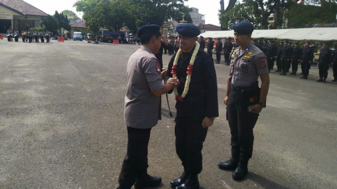 Rasa bangga di sampaikan oleh Irjen pol Muchlis dengan mengalungkan karangan bunga kepada Dansatgas Birmob polda Jambi.