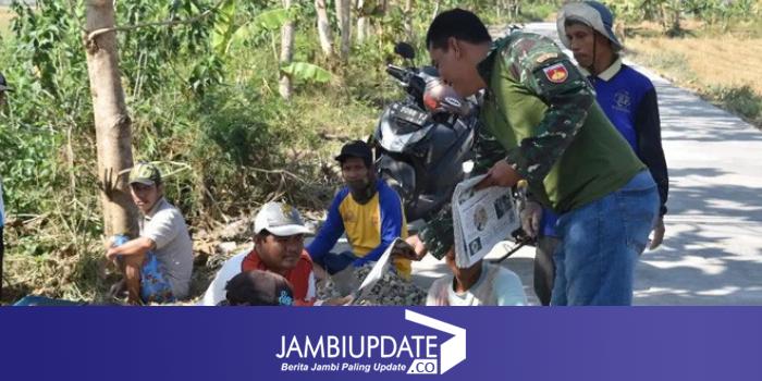 JAMBIUPDATE.CO, DEMAK -Sarana mengedukasi warga masyarakat khususnya di desa terpencil yang paling mudah dilakukan adalah dengan surat kabar. Untuk itulah Setda Jumeno anggota Satgas TMMD sengaja membawa media cetak untuk dibaca bersama disaat istirahat melaksanakan pengecoran jalan.