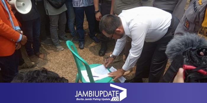 JAMBIUPADATE.CO, JAMBI - Akibat tak ditemui Gubernur Jambi massa Aliansi Peduli Karhutla dan Kabut Asap (APKKA) memaksa perwakilan Pemprov Jambi menandatangi kesepakatan percepatan penanganan Karhutla. Menariknya, massa meminta Asisten III Setda Jambi Sudirman untuk menandatangani kesepakatan di lapangan upacara, dengan maksud ikut merasakan asap dan panas yang dirasakan Provinsi ini tiga bulan belakangan.