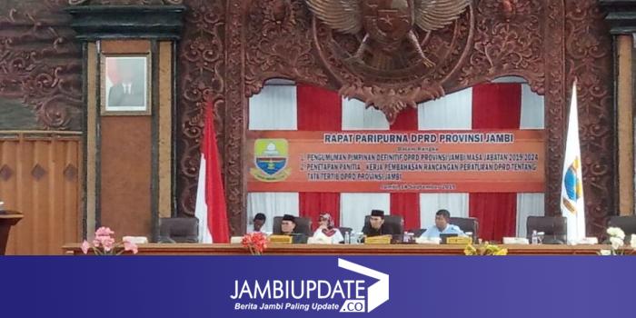 JAMBIUPDATE.CO, JAMBI- DPRD Provinsi Jambi menggelar rapat paripurna pengumuman pimpinan tetap (definitif) untuk tahun 2019-2024. Dalam rapat yang digelar di ruang rapat paripurna ini (18/9) dihadiri oleh 47 orang dan tidak dihadiri oleh delapan orang sehingga rapat dianggap kuorum.