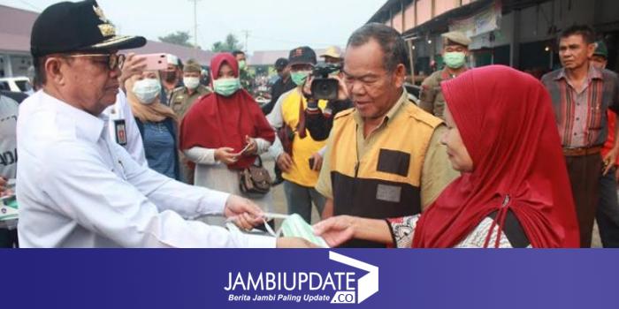 JAMBIUPDATE.CO, JAMBI - Guna mengantisipasi dampak kabut asap akibat kebakaran hutan dan lahan (Karhutla), Gubernur Jambi Fachrori Umar, turun langsung ikut membagikan masker kepada masyarakat dan pedagang di Pasar Angso Duo, Rabu (18/9).