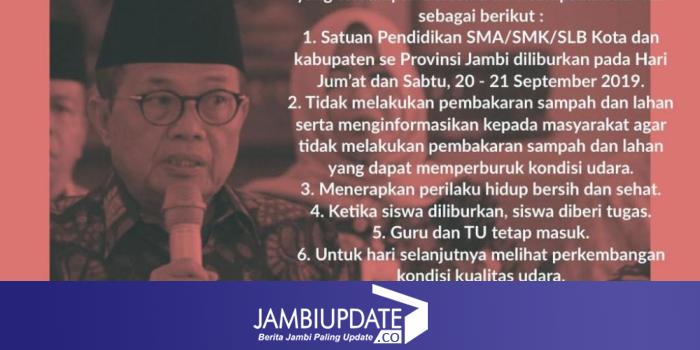 JAMBIUPDATE.CO, JAMBI - Akibat memburuknya udara di Provinsi Jambi berdasarkan perhitungan AQMS Dinas Lingkungan Hidup Provinsi Jambi, Pemprov melalui Dinas Pendidikan mengambil keputusan meliburkan siswa SMA/SMK/SLB untuk dua hari mendatang.