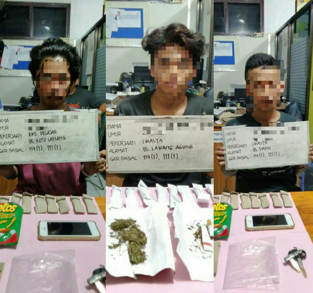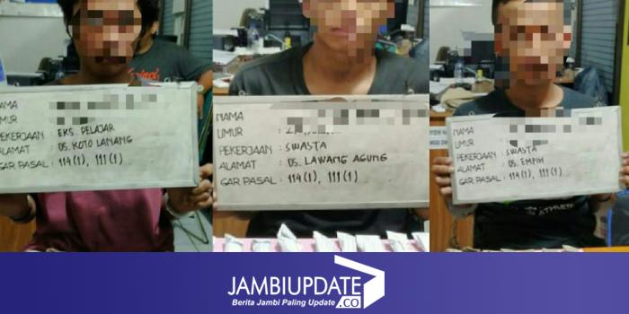 Tiga terduga pelaku peredaran ganja, yang berhasil diamankan Satres Narkoba Polres Kerinci yakni inisial AP (18), warga Desa Koto Lanang, Kecamatan Depati 7, Kerinci. Inisial DA (34) warga Dusun Empih, Kecamatan Sungai Bungkal, Sungai Penuh dan KM (22) warga Desa Lawang Agung, Kecamatan Sungai Penuh.