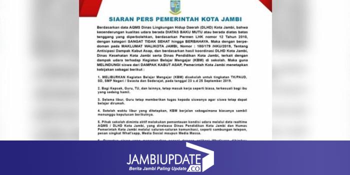 Dikatakan Abu Bakar, Juru bicara Pemkot Jambi mengatakan, berdasarkan maklumat Wali Kota Jambi, Nomor : 180/179 /HKU/2019, tentang antisipasi dampak kabut asap, dan berdasarkan hasil koordinasi DLHD Kota Jambi, Dinkes Kota Jambi serta Disdik Kota Jambi, pihaknya meliburkan KBM sekolah PAUD, TK, SD dan SMP negeri dan swasta sederajat di Kota Jambi pada 23 hingga 25 September 2019.