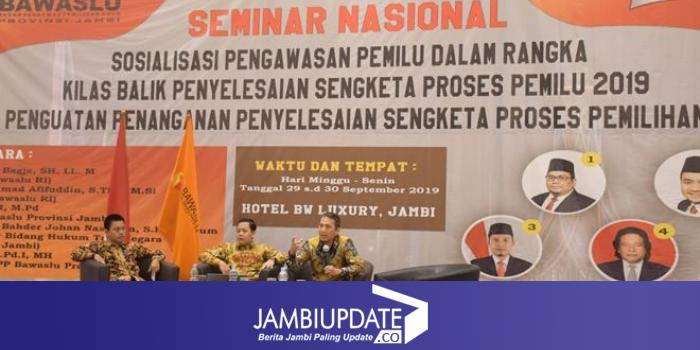 JAMBIUPDATE.CO, JAMBI- Bawaslu Provinsi Jambi menggelar seminar nasional, kilas balik penyelesaian sengketa Pemilu dan penguatan penanganan penyelesaian sengketa proses Pemilihan Kepala Daerah (Pilkada) serentak 2020, di BW Luxury, Minggu (29/9) kemarin.