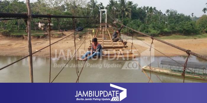 JAMBIUPDATE.CO, MUARA BUNGO-Jembatan gantung Dusun Teluk Pandak, Bungo, akhirnya diperbaiki menggunakan dana desa.