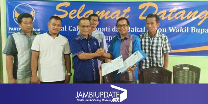 Kader partai Nasdem ini menyerahkan berkas formulir pendaftaran di Sekretariat DPD partai Nasdem Batanghari pada pukul 15.30 WIB, Rabu 16/10).