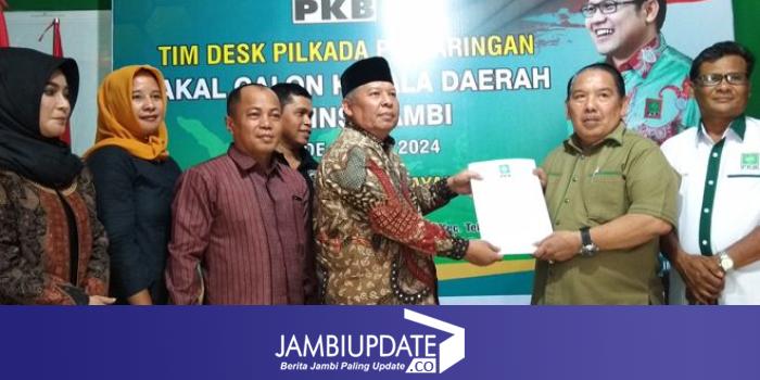 JAMBIUPDATE.CO, JAMBI- Bupati Tanjabbar Safrial, menyambangi DPW PKB Provinsi Jambi dalam rangka pengembalian formulir pendaftaran penjaringan kandidat Cagub, Kamis (14/11).