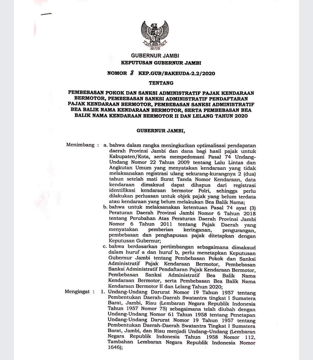 Pemutihan pejak kendaraan bermotor Provinsi Jambi tahun 2020 ini akan dimulai pada tanggal 6 Januari hingga 30 Juni 2020.