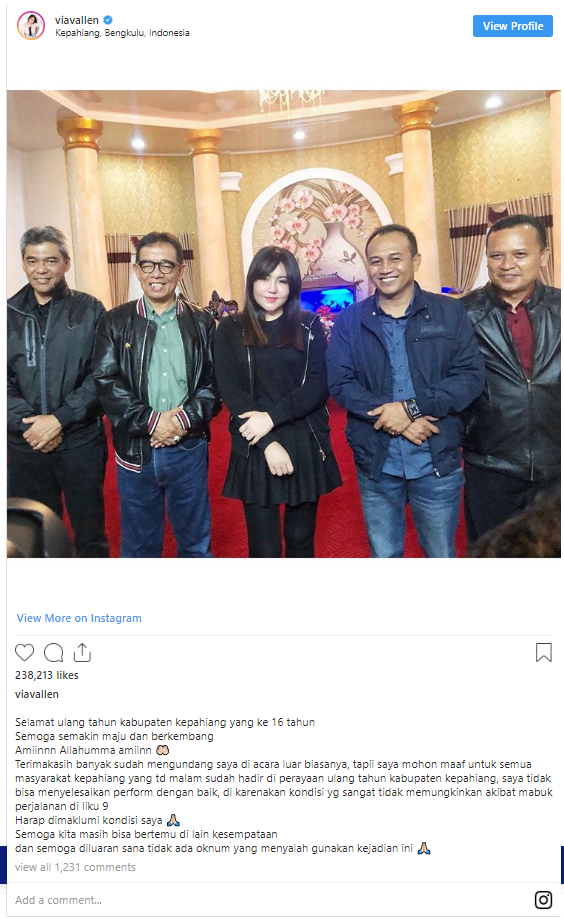“Terimakasih banyak sudah mengundang saya di acara luar biasanya, tapii saya mohon maaf untuk semua masyarakat kepahiang yang tadi malam sudah hadir di perayaan ulang tahun Kabupaten Kepahiang,” tulis Via melalui Instagram pribadinya @viavallen, dilansir pada Kamis (9/1).