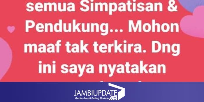 JAMBIUPDATE.CO, MUARA BUNGO - Ridwan Ibrahim menyatakan mundur dari Pemilihan Bupati Bungo. Hal ini disampaikannya melalui akun media sosial facebook miliknya, Senin (27/1) dini hari.