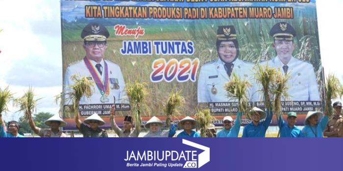 JAMBIUPDATE.CO, SENGETI- Bupati Muaro Jambi Hj. Masnah Busro SE pada Senin (16/3) pagi bersama Gubernur Jambi Fahrori Umar melaksanakan Panen Raya Tanaman Padi di Desa Pudak Kecamatan Kumpeh Ulu Muaro Jambi yang merupakan tanaman milik Kelompok Tani Usaha Sepakat.