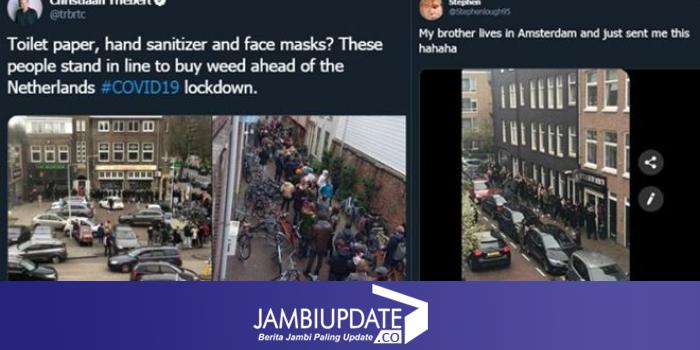 Seperti cuitan Christiaan Triebert berikut dua buat foto antrean panjang di depan kedai yang mengatakan “Tisu toilet, hand-sanitizer, dan masker? Orang-orang ini mengantre untuk membeli ganja sebelum Covid-19 lockdown diberlakukan di Belanda.”