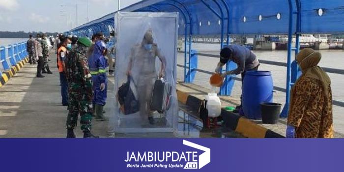 Kedatangan penumpang, seperti biasanya mendapat pemeriksaan dari tim kesehatan, penanganan Covid -19 di Pelabuhan Roro, Kualatungkal. Seluruh barang bawaan dan pakaian yang dikenakan, disemprot dengan Disinfektan.