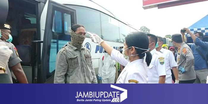 Tim Gugus Covid-19 Provinsi Jambi periksa seluruh bus dan mobil pribadi yang melintas dari arah Sumatera Selatan menuju Provinsi Jambi, Rabu (1/4), di kawasan perbatasan Provinsi Sumatera Selatan, Mestong, Muaro Jambi dengan Provinsi Jambi yang menjadi salah satu posko pemeriksaan masuk ke Provinsi Jambi.