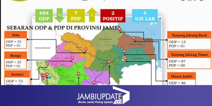 Untuk total Johansyah mengatakan (10/4) ada 694 ODP, kemudian PDP ada 7 orang (meningkat 2). Sementara yang dinyatakan masih dua orang yakni pasien asal Tebo yang dirawat di RSUD dRaden Mattaher dan Pasien asal Kerinci yang dirawat di RSU MHA Thalib Kerinci.