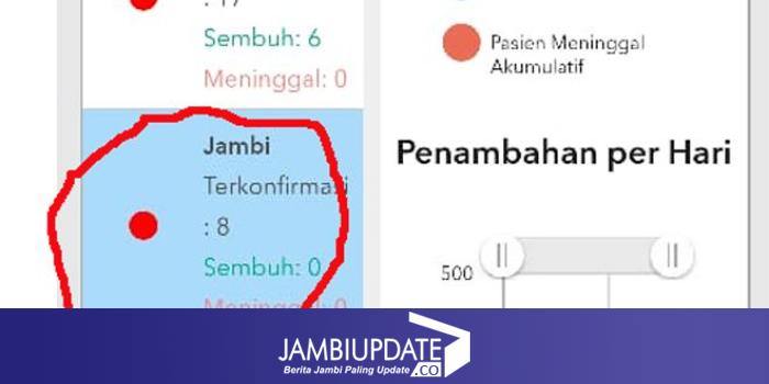 Untuk Jambi kasus positif corona terkonfirmasi masih 8 kasus, atau sama dengan jumlah kemarin (17/4). Pada keterangan situs ini terlihat pembaruan terakhir 16.05 WIB saat diakses Jambiupdate 16.15 WIB.