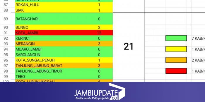 Hasilnya, dari laporan yang dibagikannya ada Kota Jambi yang zona merah. Lalu menyusul Merangin dan Tanjab barat sebagai zona oranye. Kemudian ada Kota Sungai penuh yang zona kuning. Dan tujuh kabupaten lainnya masih zona hijau.