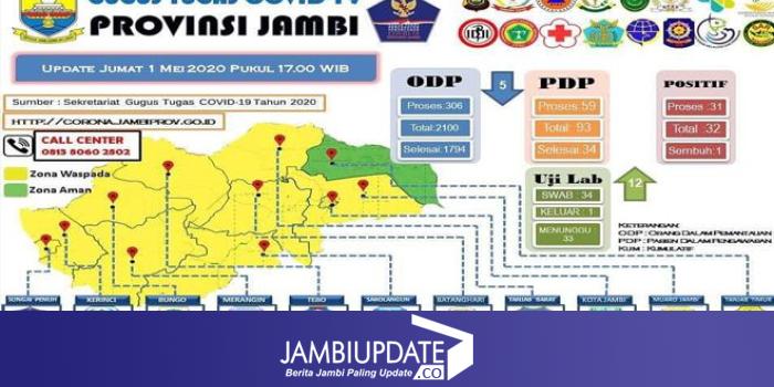 JAMBIUPDATE.CO, JAMBI - Gugus tugas penanganan Covid19 Provinsi Jambi mengumumkan perkembangan Corona 1 Mei hingga pukul 17.00 WIB.