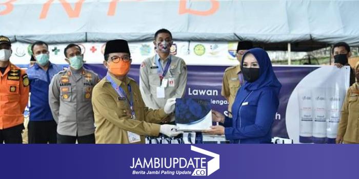 JAMBIUPDATE.CO, JAMBI - Gubernur Jambi, Fachrori Umar mengapresiasi bantuan seribu hand sanitizer dari PT. Kosmetikatama Super Indah dihalaman Kantor BPBD Provinsi Jambi, Selasa (5/5).