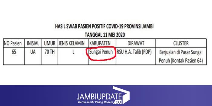 Pasien ini disebut sebagai pasien 65, berprofesi sebagai pedagang di Pasar Sungai Penuh. Pasien 65 ini dinyatakan pernah kontak dengan pasien 64 yang juga berprofesi sama, yang ditetapkan positif Covid19 sehari sebelumnya.