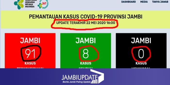 Keterangan ini seperti dilansir pada situs pusatkrisis.kemkes.go.id. yang diakses Jambiupdate pada pukul 16.02 WIB. Disana tertulis kasus terkonfirmasi ada 91 kasus, dimana 8 orang diantaranya sudah dinyatakan sembuh. Atau kini ada 83 orang Positif Covid19 yang sedang dalam perawatan.