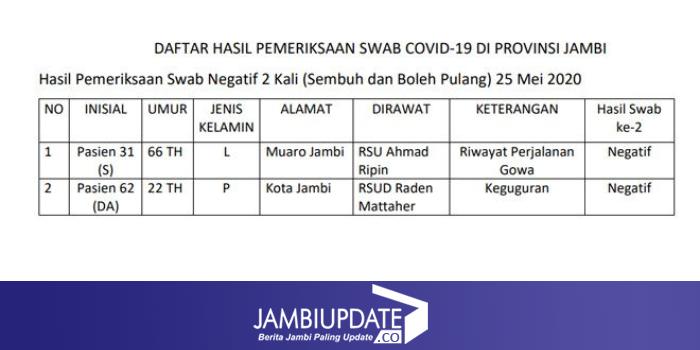 JAMBIUPDATE.CO, JAMBI - Pasien Covid19 Provinsi Jambi kembali dinyatakan sembuh. Pada hari ini (25/5) ada dua pasien positif yang hasil swabnya sudah dua kali negatif, sehingga dinyatakan sembuh dan diperbolehkan pulang.