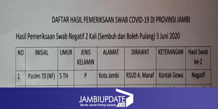 JAMBIUPDATE.CO, JAMBI - Dua pasien positif Covid19 asal Kota Jambi dinyatakan sembuh hari ini (3/6). Keduanya berumur dibawah 11 tahun, dan merupakan penularan Covid19 yang berkontak dengan Cluster Gowa.