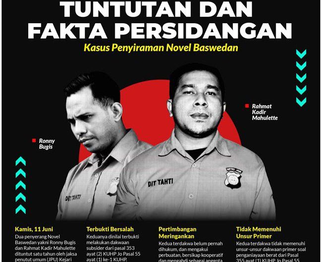 Sebelumnya Jaksa Penuntut Umum (JPU) menuntut dua orang terdakwa pelaku penyiram air keras, Rahmat Kadir Mahulette dan Ronny Bugis terhadap Novel Baswedan dengan pidan satu tahun penjara.