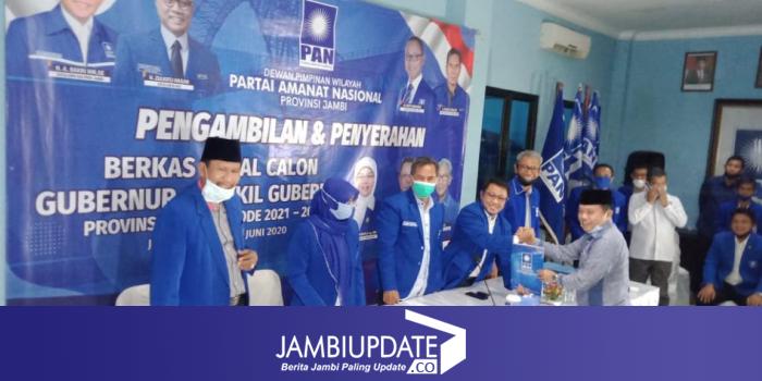 JAMBIUPDATE.CO, JAMBI- Bupati Merangin Al Haris bersama Abdullah Sani, menjadi kandidat pertama yang mengambil formulir pendaftaran penjaringan kandidat Cagub dan Cawagub Jambi di DPW PAN Jambi, Senin (15/6).