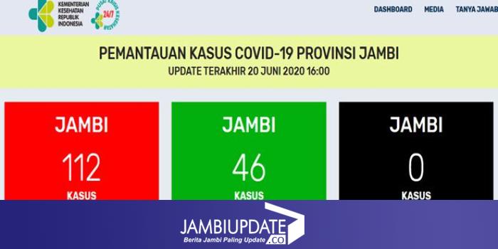 JAMBIUPDATE.CO, JAMBI - Jumlah pasien positif Covid19 tak mengalami bpenambahan pada hari ini (20/6). Total kasus sejauh ini masih berjumlah 112 kasus, dan pasien sembuh masih 46 yang sembuh.
