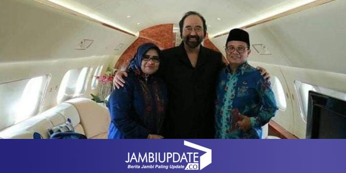 Teranyar, beredar foto calon petahana Fachrori Umar bersama pendiri NasDem Surya Paloh. Dalam foto tersebut, juga terlihat istri gubernur Jambi Rahima didaalam satu pesawat.