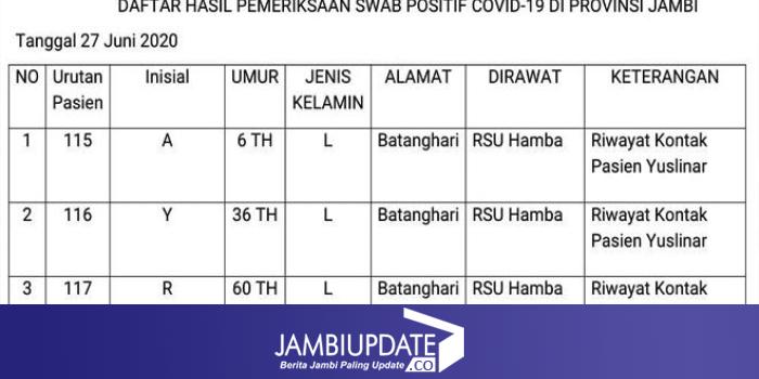 Ketiganya adalah laki-laki yang berasal dari Kabupaten Batanghari, dan kini di rawat di RSU Hamba. "Untuk identitas Pasien 115 berinisial A umur 6 tahun, pasien 116 berinisial A umur 36 tahun, dan pasien 117 berinisial R umur 60 tahun," jelasnya.