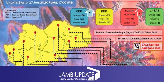 JAMBIUPDATE.CO, JAMBI- Selain tambahan 3 positif dan 3 pasien sembuh Covid19 pada hari ini (27/6), ternyata ada satu hasil swab lagi yang keluar dengan hasil negatif Covid19.