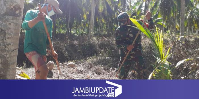 Kuala Tungkal, Komandan Satgas TMMD Reguler ke 108 Kodim 0419/Tanjab Letkol Inf Erwan Susanto disela waktu istirahat siang melaksanakan Komsos sekaligus membantu Petani Kelapa memanen kelapa di kebun milik Pak Sukri warga Dusun Sungai Kapas Desa Labuhan Pring Kec. Sadu Kab. Tanjab Timur, Jumat (3/7/2020).