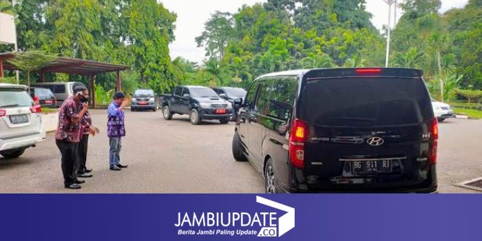 Saat pulang dari Kantor Gubernur Jambi Giri tampak diantar menuju mobilnya oleh Safrial, yang ditemani dua ASN Provinsi Jambi.