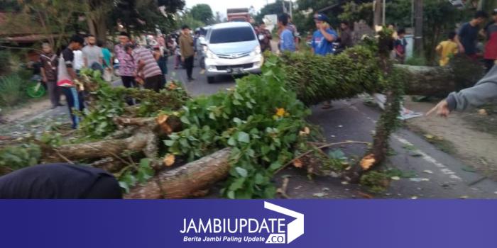 JAMBIUPDATE.CO, SENGETI- Sebatang pohon tua yang tumbuh di pinggir jalan lintas timur, tepatnya di RT 07 Desa Sekernan Kecamatan Sekernan, Kabupaten Muaro Jambi, pada Minggu (12/7) sore tumbang. Akibatnya, seorang pemotor menjadi korban.